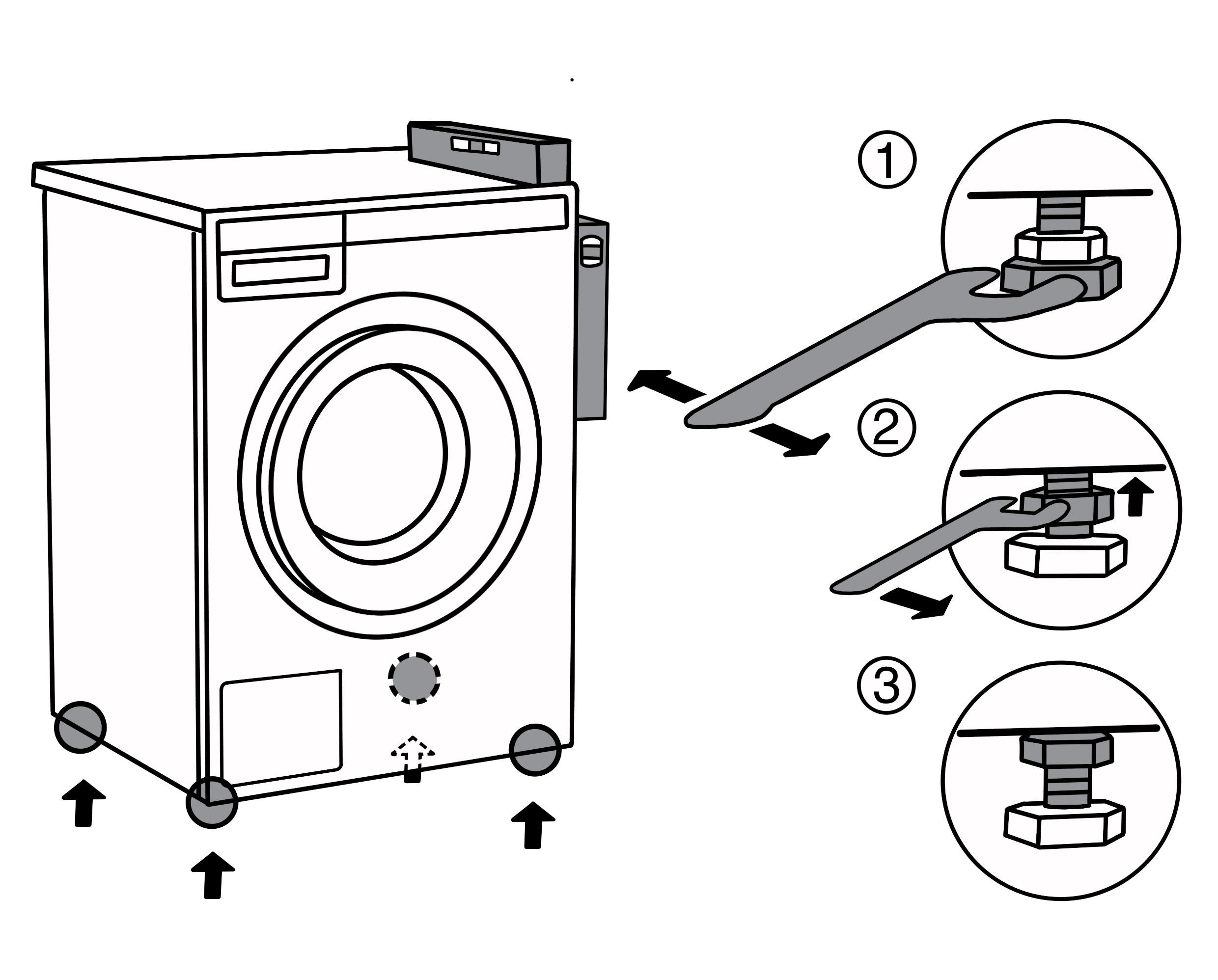 - Stel de voetjes van de wasmachine goed af en draai de contramoer (nummer 3 op onderstaande afbeelding) helemaal aan om lawaai, trillingen en het verschuiven van de wasmachine zoveel mogelijk te beperken.